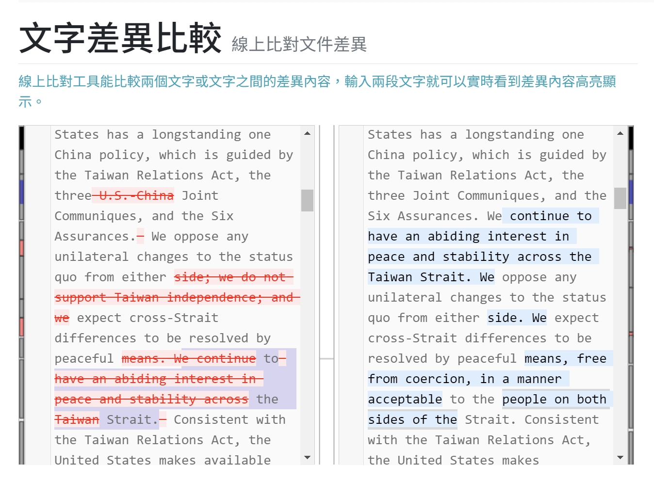 新版內容拜登時期(2022.5.28)的概況,透過「文字差異比較」線上工具進行比對,可以看到部份用字遣詞有修改,例如針對美國在台協會(AIT)的敘述,從「non-governmental organization」變成「non-profit corporation」。