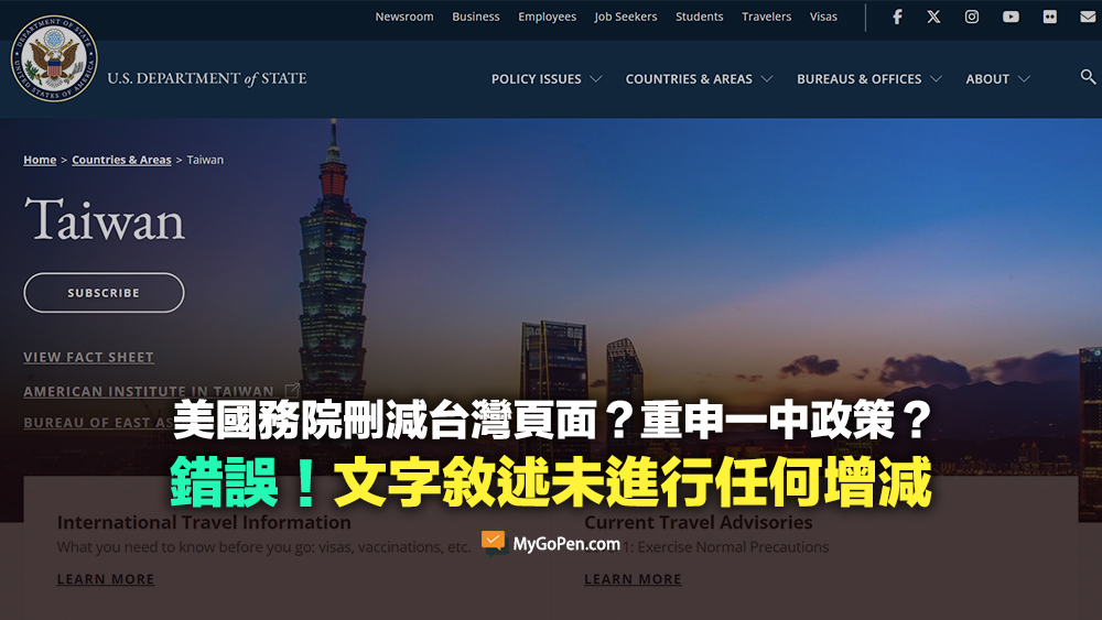 【錯誤】美國務院刪減台灣頁面?重申一中政策?與事實不符!文字敘述未進行任何增減