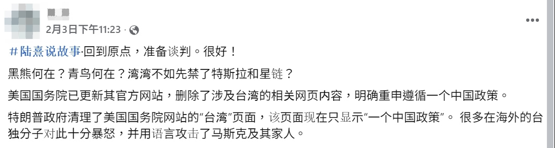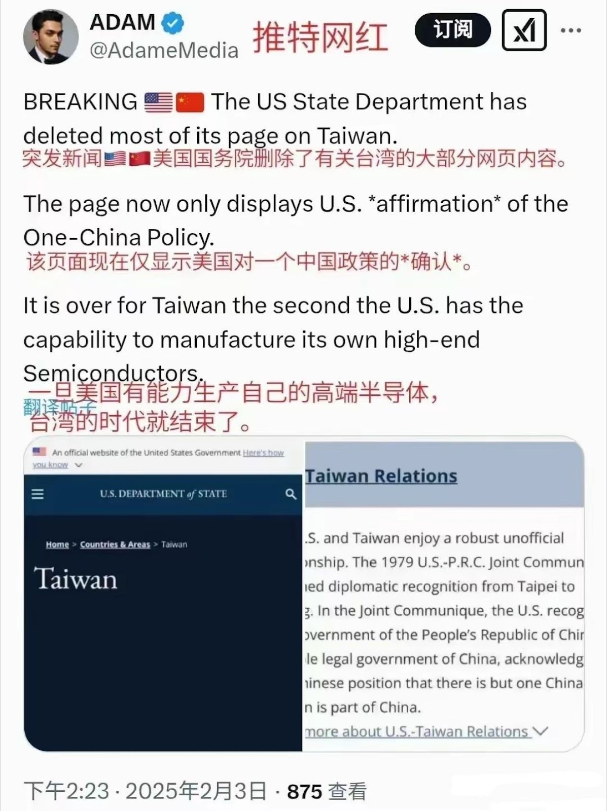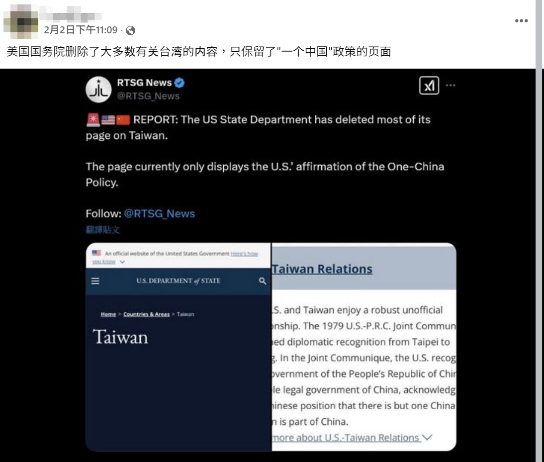 MyGoPen 檢視網傳訊息擷圖,可以找到 X 平台用戶「RTSG News」、「ADAM」等於 2025 年 2 月 3 日的貼文,聲稱美國國務院網站刪除大部分與台灣有關的內容,該頁面目前只顯示美國承認一中政策。