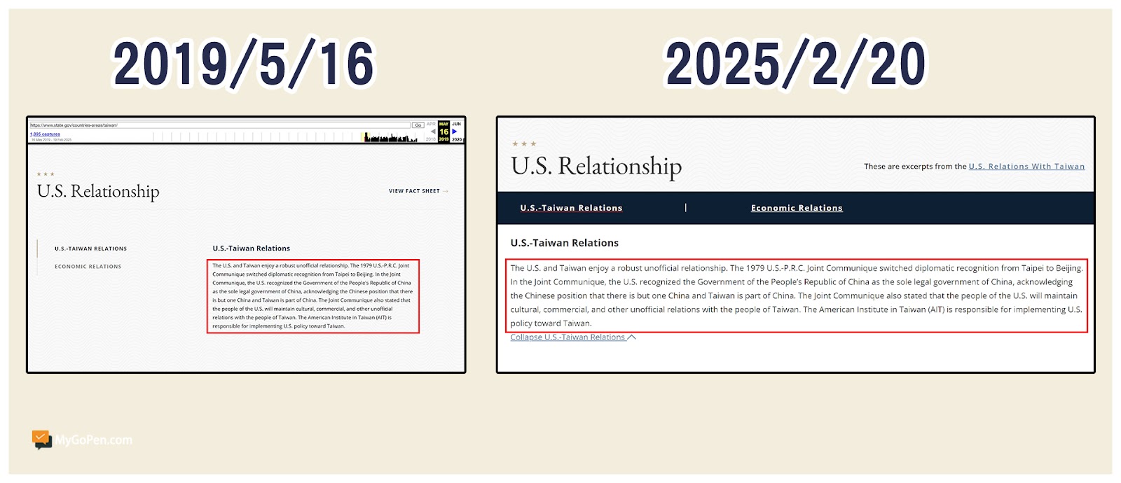 利用網頁存檔工具 WayBack Machine 搜尋國務院過去的網頁,可以看到最早的記錄是在 2019 年 5 月 16 日,有關「美台關係」的敘述在網頁最下方,經比對後,確認一字一句與現在的網站內容完全一致。