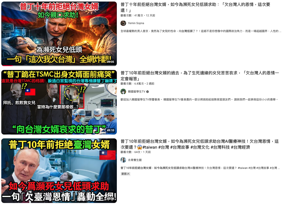 網傳「普丁承認欠台灣人情」的影片及訊息,內容聲稱日前一名在俄羅斯工作的台灣工程師接到克林姆林宮的電話,表示普丁的小女兒卡捷琳娜(Katerina Putin)命危,只有台灣是唯一可以拯救她的國家。經查證,網傳影片出自 YouTube 內容農場頻道「韓國留學生 TV」,該頻道發布的影片皆由 AI 配音、AI 生成影像及聳動標題組合而成,影片中的內容多為虛構,或是有少部分為事實,但經過加油添醋改寫,沒有任何證據顯示普丁的女兒近期有來台灣看病,網傳訊息沒有事實依據。