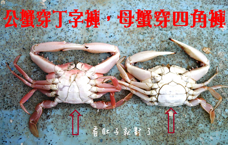公蟹呈尖長形(丁字褲), 母蟹呈半圓形(四腳褲),是不是很妙呢?
