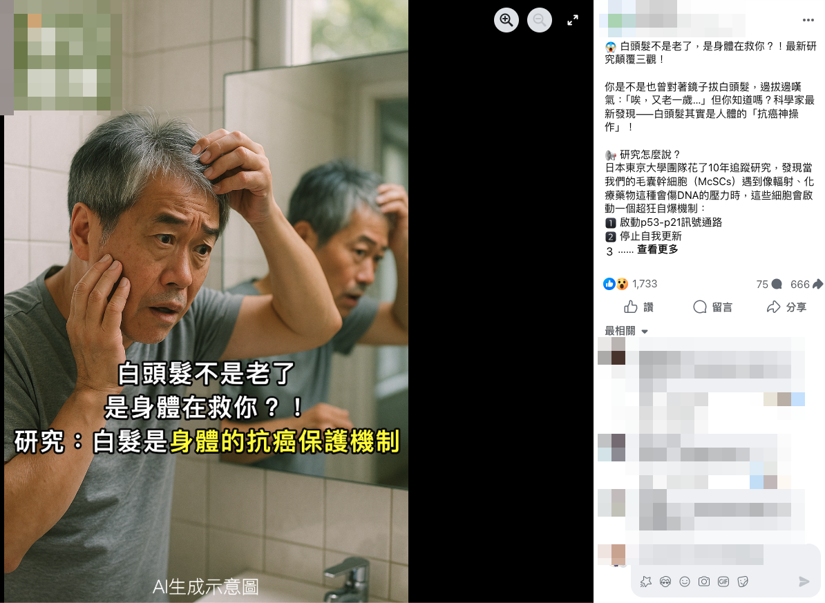 【錯誤】網傳長白頭髮是代表身體在抗癌的研究?誤導描述!皮膚科醫師詳解實驗內容