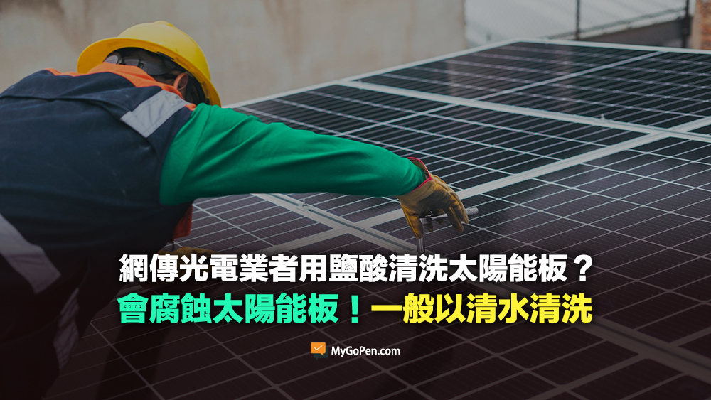 總結來說,太陽能板只需使用清水清洗即可,用鹽酸清洗會腐蝕板面、支架及線路等,不太可能會有「鹽酸清洗太陽能板」的情事發生。
