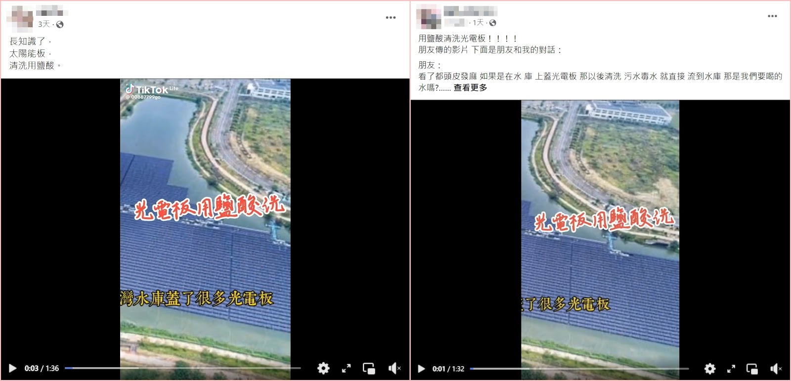 網傳「鹽酸洗發電太陽能板」的影片及訊息,內容聲稱有民眾拍到光電業者使用鹽酸清洗太陽能板。經詢問專家,太陽能板只需使用清水跟刷子清潔即可,使用鹽酸或是其他添加腐蝕性溶液的清潔劑,都有可能造成太陽能板、支架及線路等受損,不太可能會有業者用鹽酸洗太陽能板。
