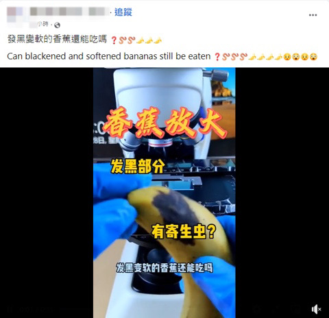 網傳「發黑變軟的香蕉還能吃嗎?」為題的影片,片中字幕提到發黑變軟的香蕉,說在顯微鏡底下看到蟲蠕動的狀況。但專家表示,畫面中的應是果蠅幼蟲,是香蕉果皮擦壓傷後變黑變軟、甚至果肉外露,吸引果蠅產卵、孵化所致,並非傳言說的「香蕉發黑變軟就會生蟲」,勿因此過度解讀。