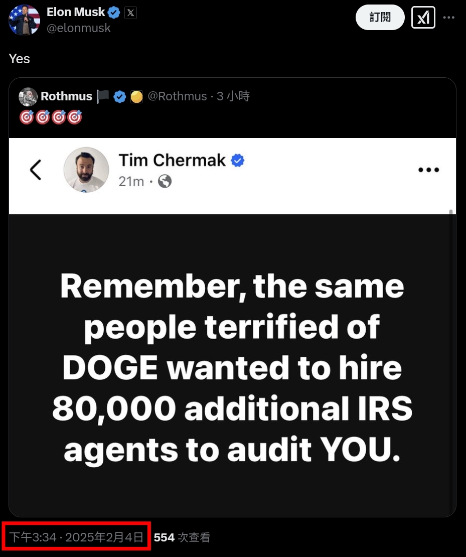 檢視馬斯克個人 X 帳號,截至台灣時間 2025 年 2 月 4 日15:30,馬斯克仍持續在 X 上發表對美國政策實施的看法,最新一則是回覆用戶「Rothmus」對於政府效率部(DOGE)欲解散美國教育部的看法。