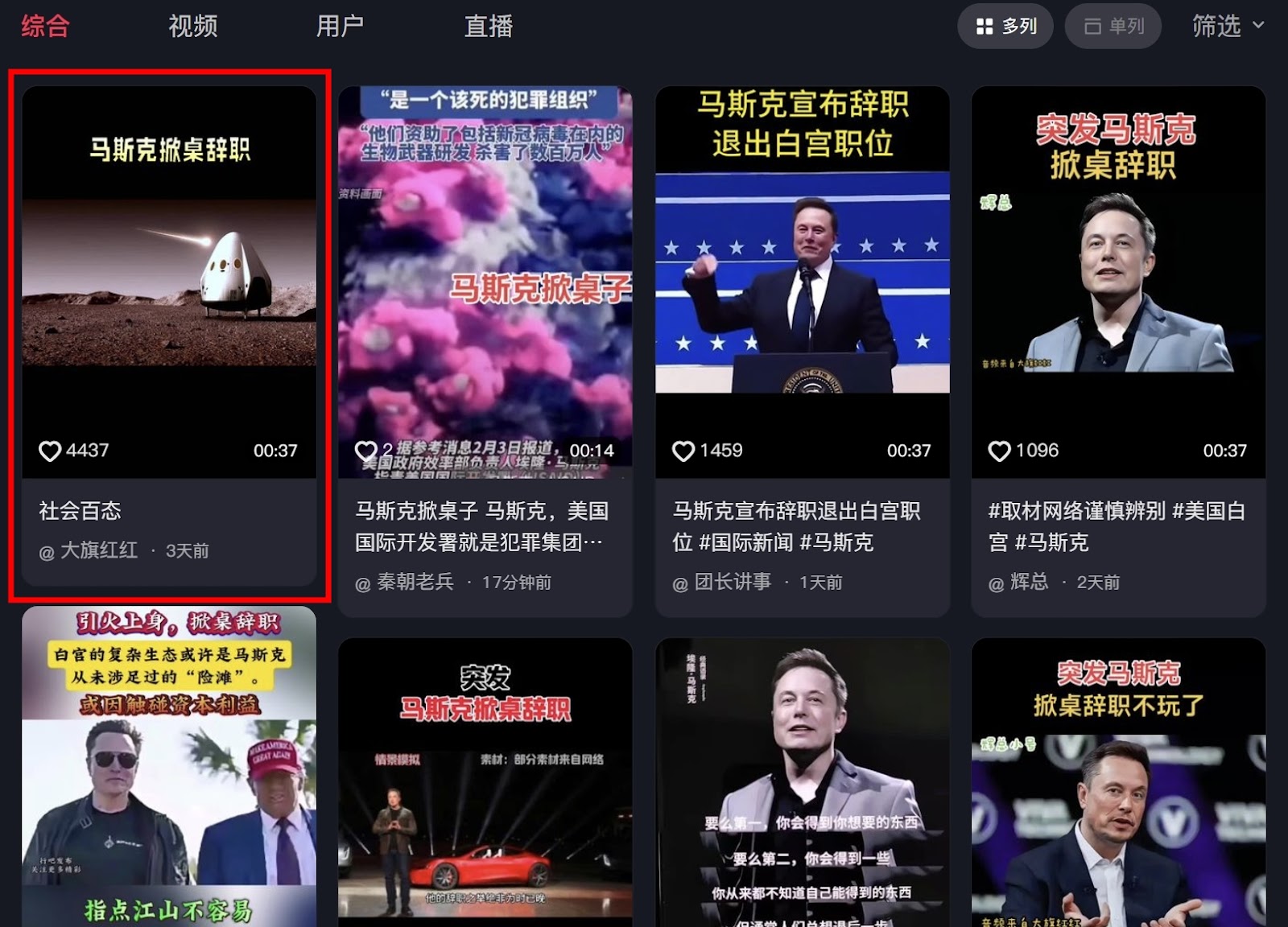 網傳「馬斯克掀桌辭職」的影片及訊息,內容聲稱特斯拉創辦人馬斯克(Elon Musk)近期「掀桌辭職」,宣布退出白宮團隊,回到電動車戰場,原因是不想在華府繼續當傀儡。經查證,網傳影片於 2025 年 2 月 1 日開始在中國影音平台抖音上出現,之後約 4、50 名用戶發布相同語音內容、不同資料畫面的影片,不過檢視馬斯克個人 X 帳號,可以看到他依舊發布許多與削減美國聯邦政府支出有關的推文,而他目前仍是美國政府效率部(DOGE)的負責人,他雖然沒有權力直接裁撤政府部門或削減支出,但可以提供建議給川普團隊,沒有跡象顯示馬斯克已辭職不幹,網傳訊息沒有事實依據。