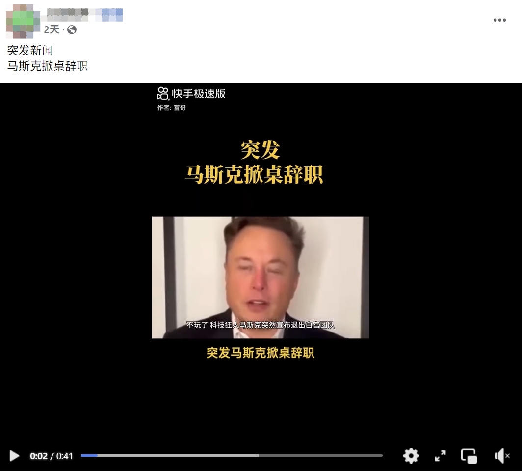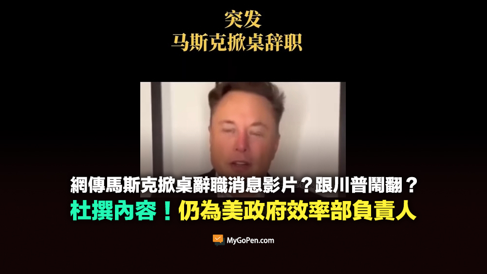 【錯誤】網傳馬斯克掀桌辭職?跟川普鬧翻?杜撰內容影片!仍為美政府效率部負責人