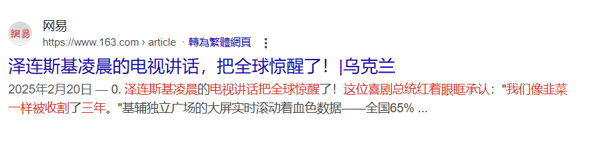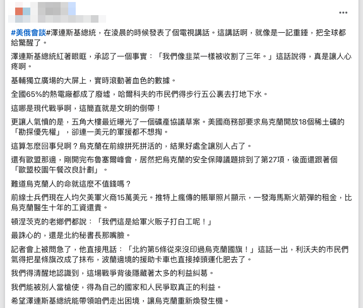 網傳「烏克蘭總統澤連斯基,在凌晨的時候發表了個電視講話」、「我們像韭菜一樣被收割了三年。」的文章。經查證,傳言最早至少在 2025 年 2 月 20 日出現,發佈在中國平台「網易」上,後被 Facebook 粉絲專頁「兩岸頭條」轉成繁體字流傳,相關內容並非可靠的資訊來源;而烏克蘭總統澤倫斯基在 2025 年 2 月共發表 22 次談話,均無網傳文章所述的內容,傳言為錯誤訊息。