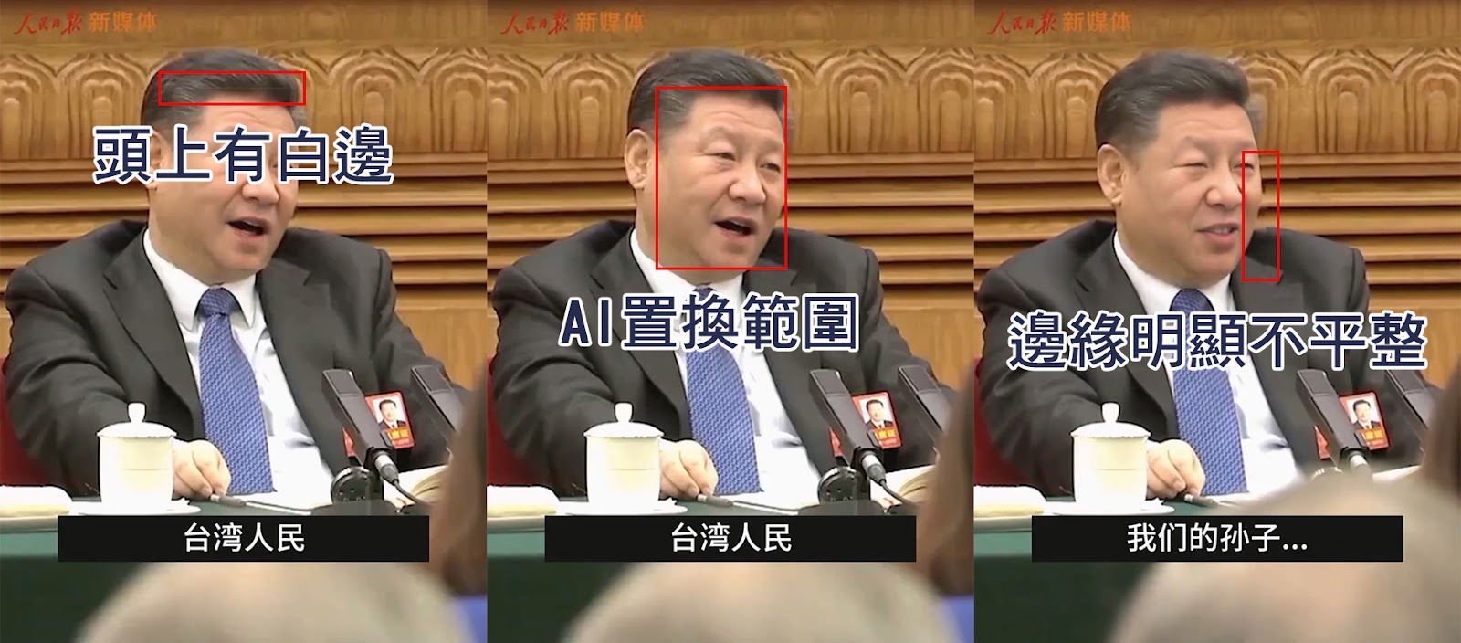 如果將影片放大逐格檢視,就會發現習近平的臉上有覆蓋一個長方形透明圖層,可以看到頭髮處有白邊,是長方形圖層的上沿;紅色方框則為長方形圖層的範圍,而在部分影格中,會發現習近平的臉與背景牆壁有模糊的情況,邊緣明顯不平整,依此確認網傳影片是利用 AI 技術進行人物口型置換及語音合成,並非原始影片內容。