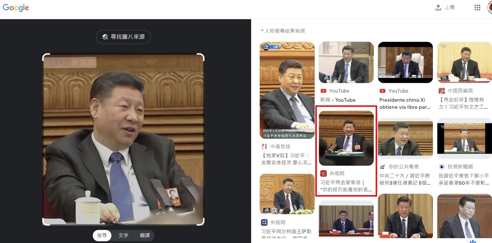 利用圖片反搜工具「 Google Lens 」進行搜索,可以找到中共官媒《央视网》2022 年 3 月 2 日的報導《习近平两会家常话|“你的经历就像你的名字”》,內文第一張圖片是習近平 2018 年 3 月 7 日參加十三大全國人大一次會議廣東代表團審議時的照片,檢視其衣著、識別證、木質背景及麥克風位置等,皆與網傳影片相似。