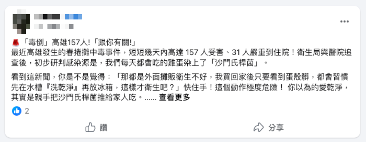 網傳「毒倒高雄157人!跟你有關」的文章,內文描述買回家先洗是錯的、摸蛋=摸毒。但根據疾管署官網衛教,沙門氏菌的傳染途徑為「受污染的水或食物(例如:生的或未煮熟的雞蛋、牛奶、肉類及其製品、水果等)、接觸受感染的動物,或人與人經由糞口途徑傳播所致」,可見傳言過於簡化、易造成誤解。