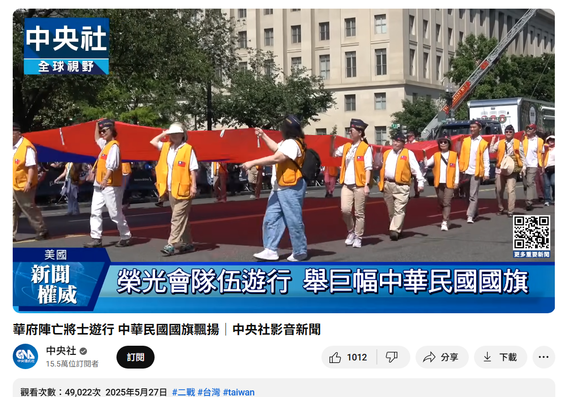 中央社 YouTube - 華府陣亡將士遊行 中華民國國旗飄揚|中央社影音新聞