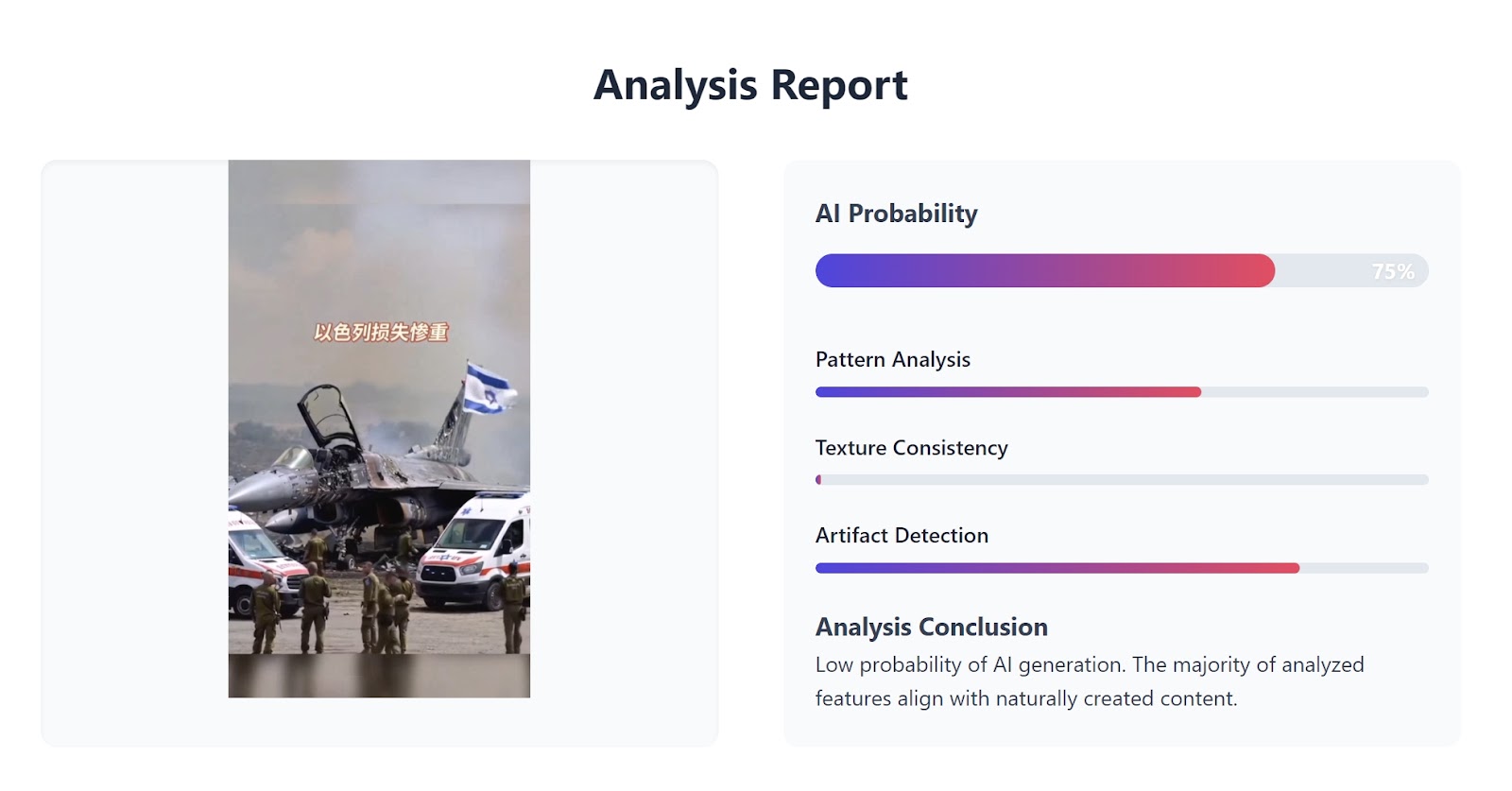 補充:MyGoPen 過去做過許多與天災有關的 AI 影像查核,發現要辨別影像真偽還有一個方法,可以觀察影片中的人群與場景互動是否合理。以網傳影片為例,如果真的有一架戰機毀損嚴重,不太可能出現一群人站在旁邊沒事做的情形;客機片段也一樣,畫面中的消防員應該是全力灌救失火部位,而不是站得遠遠的,彷彿沒有看到失火一樣。