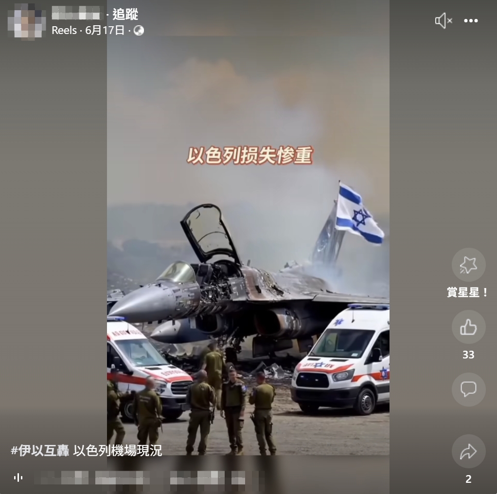 網傳「以色列損失慘重」的影片及訊息,畫面顯示在伊朗對以色列發動反擊後,以色列疑似有戰機毀損嚴重,還有一架停在機場的客機起火燃燒。經查證,網傳影片有 2 個不同片段,皆為 AI 生成影像,由 TikTok 用戶「falsetineboy67」上傳,該用戶發布過許多以色列機場或飛機毀損的 AI 作品,目前已全數刪除或下架,2 個片段皆非真實畫面,網傳訊息不正確。
