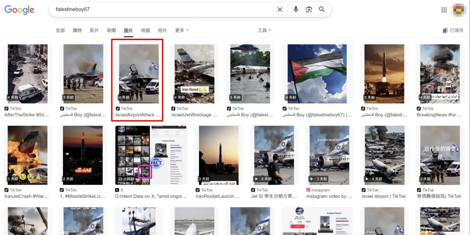 以此進行搜索,可以確認該作者曾上傳過一系列以色列飛機遭攻擊的短片,並且有許多用戶轉發及重新上傳,但實際點進「falsetineboy67」的作品頁面,會發現相關影片已全部下架或刪除,目前已經找不到原始檔案,僅能透過 Google 網頁仍留存的圖片,確認原始影片網址為「https://www.tiktok.com/@falestineboy67/video/7516073667785149742」。