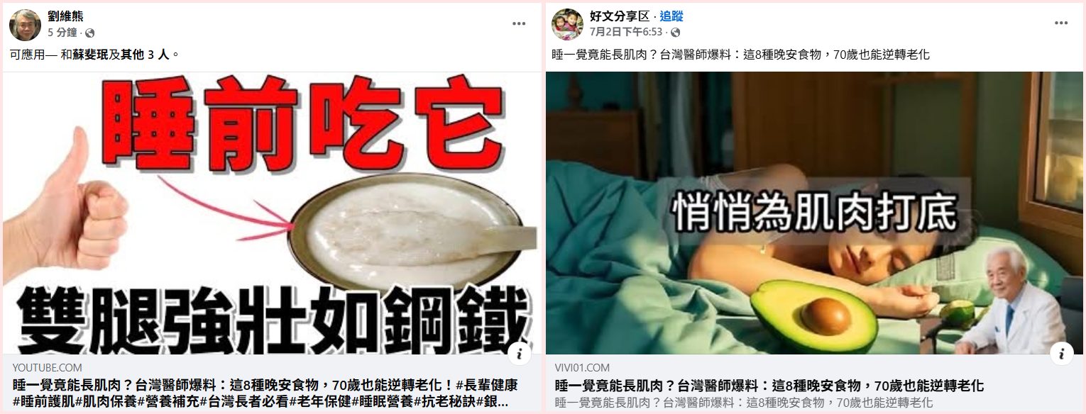 網傳「睡一覺竟能長肌肉」、「8 種晚安食物」的貼文及影片,提到睡覺時會流失肌肉,這八種高蛋白食物能幫助邊睡邊增肌,睡前半小時到一小時吃是黃金時間。但專家表示,傳言提到的除了紅藻蛋白「食品」以外,其他的都是高蛋白「食物」,比碳水化合物難消化,睡前肚子餓或是熬夜想要補充熱量,最好是以天然的、簡單的碳水化合物為優先,比較不會造成腸胃消化負擔,也能避免胃食道逆流等腸胃不適。