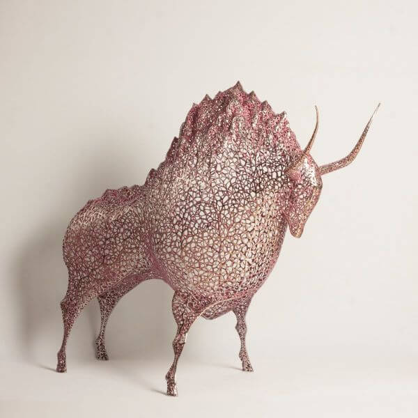 姜東見以有機的造型,同時賦予了冰冷金屬生命力與溫度。在不同階段的創作裡,一部分作品組構出了完整的形象,或者將動物的背部與山脈的造型融合。在超現實的思維下,形塑生物們與這片大地之間共生共存的狀態。而另一部分的造型則是以一種開放、向上延伸的方式出現。這樣的造型很自然地與植物向上生長的姿態相連,形塑出一種向著陽光、一點點成長的動態感。讓動物與植物的共生不單純是一個概念,而是可以被感受到的進行中狀態。