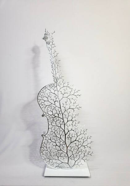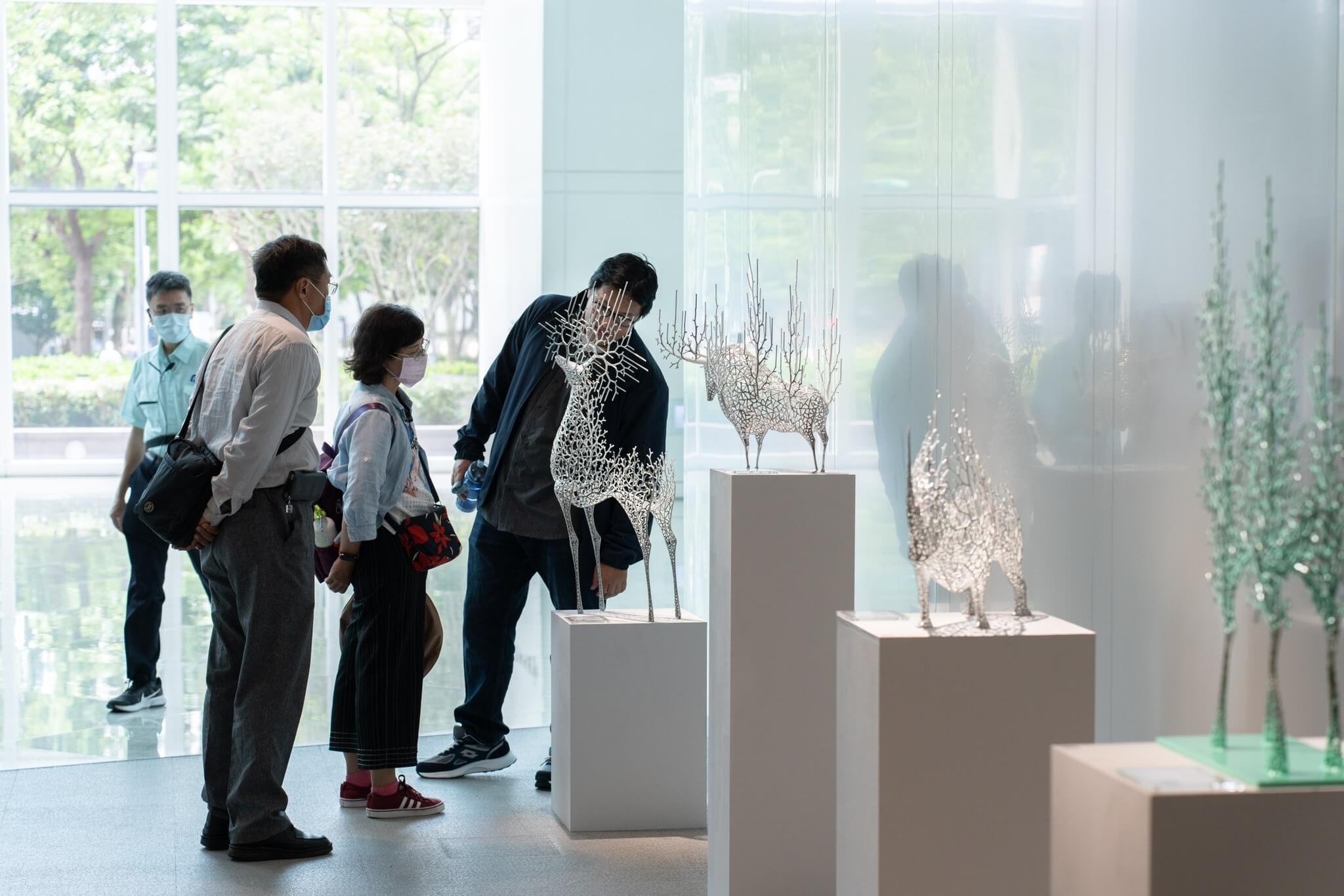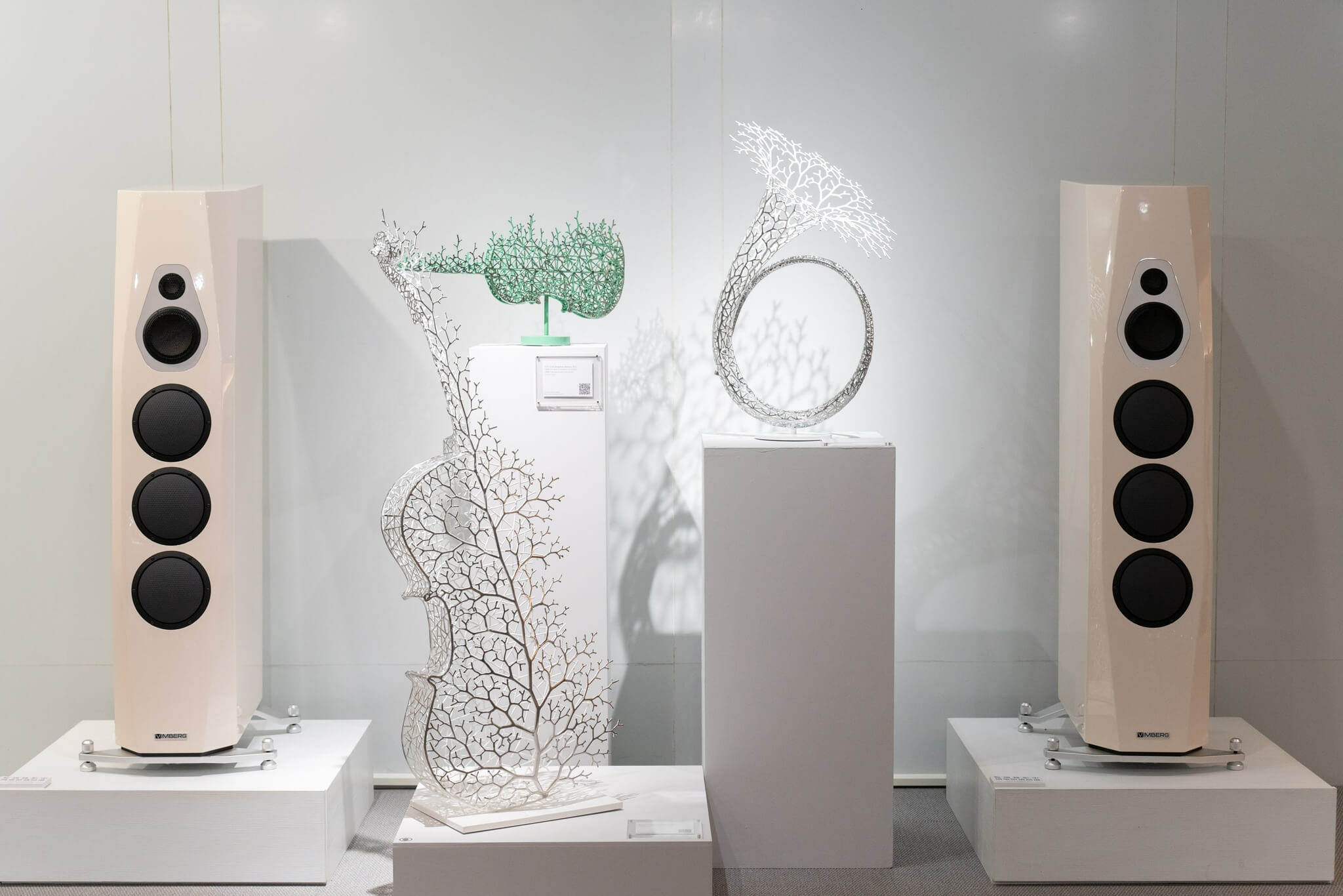 在以動物為主軸的同時,姜東見也在《共存之森》系列中發展了從樂器中取材的子題。同樣以植物生長的意象為基礎,樂器子題的造型顯得更加舒展。一般來說,樂器(非生物)的本質與姿態豐富的動物並不相同。而姜東見卻以虛化邊界線的方式,對於造型進行解放。打造出與生命生長不同,另一種「旋律在森林中流淌」的知覺暗示。巧妙地運用虛實切換,使視覺與聽覺的記憶重疊。《共存之森 - 四季》的總體策展,在氛圍營造上也邀請了繆思客訂閱 Mousike合作。在現場設置了 Mino音響組。透過其雅緻的造型與音色,讓展場中的造型藝術也具備了聽覺的感官暗示。不僅僅增添了美感體驗的層次,也對於「共生」的概念提出了另一種思考的脈絡。