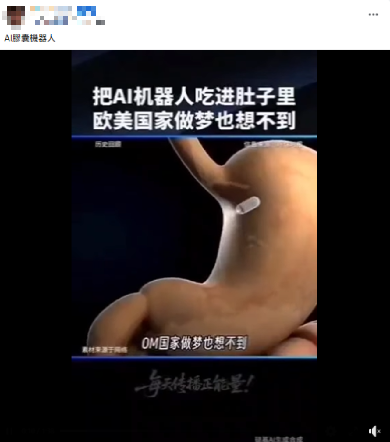 網傳「AI 膠囊機器人」、「把 AI 機器人吃進肚子裡」的影片,片中提到中國研發出 AI 膠囊機器人,吞進肚裡可以取代消化道內視鏡檢查。但專家表示,加了磁控技術、即時影像的升級版「內視鏡膠囊」,不能講成「膠囊機器人」,再好的醫療科技還是有市場化的考驗,以臺灣為例,內視鏡膠囊在臺灣早已有醫院、診所引進,但不算普及,因為自費價格上萬元,傳言不提國際大廠才是全球市占率第一、不講自費價格使得市場受限,未提及全面的資訊。